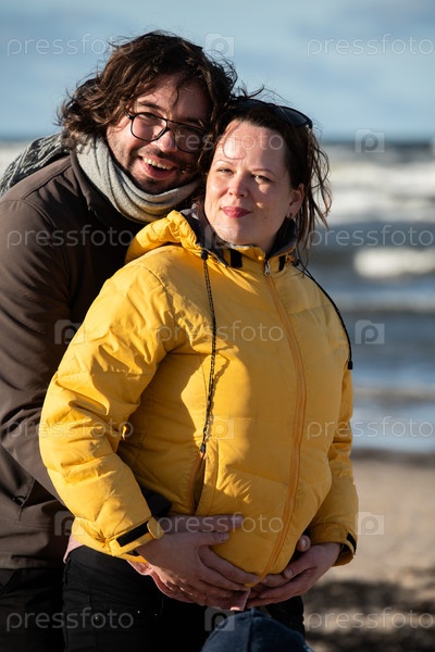 Пара стоит обнявшись на песчаном пляже в холодный осенний день, позади них простирается безмятежный океан, и они разделяют тихий момент любви и тепла среди прохладного бриза и мирной обстановки