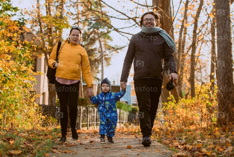 Влюбленная пара прогуливается по залитому солнцем парку со своим маленьким сыном, окруженная яркими красками осени, наслаждаясь радостными и мирными моментами совместного семейного общения