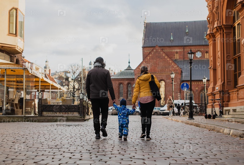 Родители идут рука об руку со своим сыном по очаровательным городским улицам, наслаждаясь теплом времени года и создавая радостные воспоминания вместе