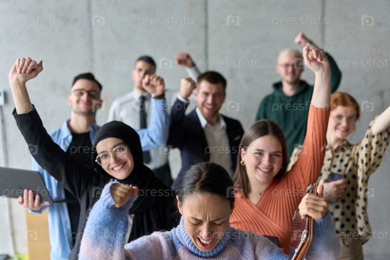 Разнообразная команда профессионалов бизнеса с восторгом празднует свой успех в современном офисе, выражая триумф и единство после достижения своих целей