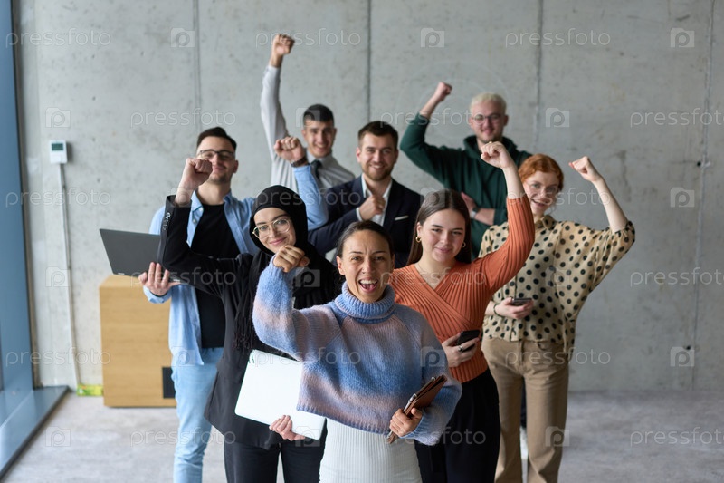 Разнообразная команда профессионалов бизнеса с восторгом празднует свой успех в современном офисе, выражая триумф и единство после достижения своих целей