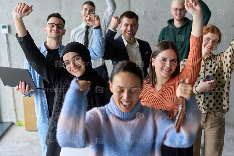 Разнообразная команда профессионалов бизнеса с восторгом празднует свой успех в современном офисе, выражая триумф и единство после достижения своих целей