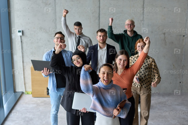 Разнообразная команда профессионалов бизнеса с восторгом празднует свой успех в современном офисе, выражая триумф и единство после достижения своих целей