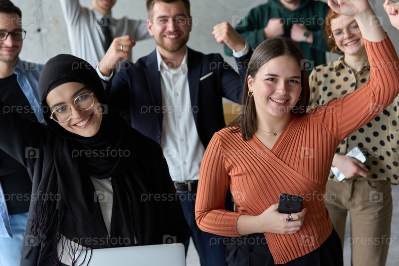 Разнообразная команда профессионалов бизнеса с восторгом празднует свой успех в современном офисе, выражая триумф и единство после достижения своих целей