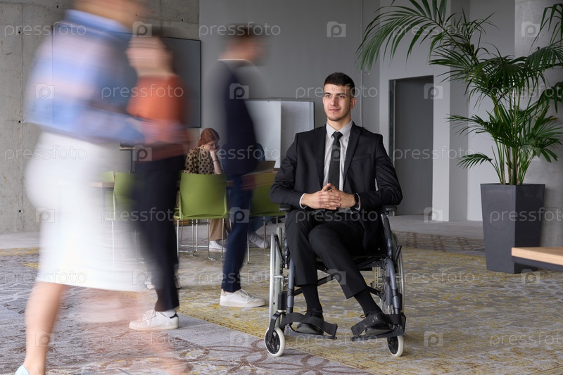 Бизнесмен в инвалидной коляске передвигается по оживленному офису в окружении коллег, которые активно заняты своей работой и сотрудничеством