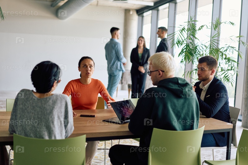 Разнообразная команда профессионалов в сфере бизнеса ведет дискуссию за столом переговоров в офисе, в то время как их коллеги сотрудничают на заднем плане