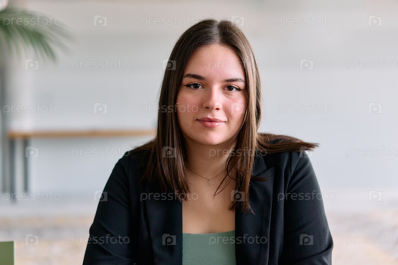 Портрет молодой бизнес-леди крупным планом, участвующей в профессиональной встрече, уверенно обсуждающей идеи и стратегии со своими коллегами