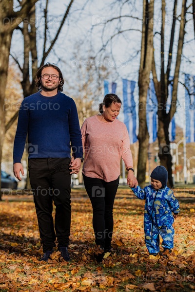 Влюбленная пара прогуливается по залитому солнцем парку со своим маленьким сыном, окруженная яркими красками осени, наслаждаясь радостными и мирными моментами совместного семейного общения