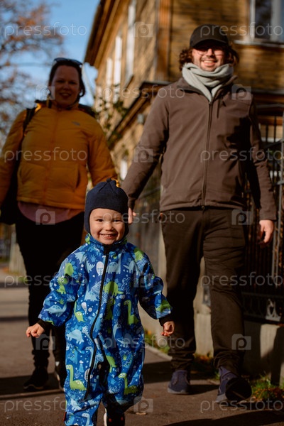 Влюбленная пара прогуливается по залитому солнцем парку со своим маленьким сыном, окруженная яркими красками осени, наслаждаясь радостными и мирными моментами совместного семейного общения