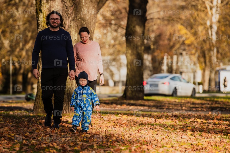 Влюбленная пара прогуливается по залитому солнцем парку со своим маленьким сыном, окруженная яркими красками осени, наслаждаясь радостными и мирными моментами совместного семейного общения