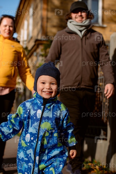 Радостный маленький мальчик в зимнем пальто и шапке играет в парке, окруженный любовью и теплом своих улыбающихся родителей
