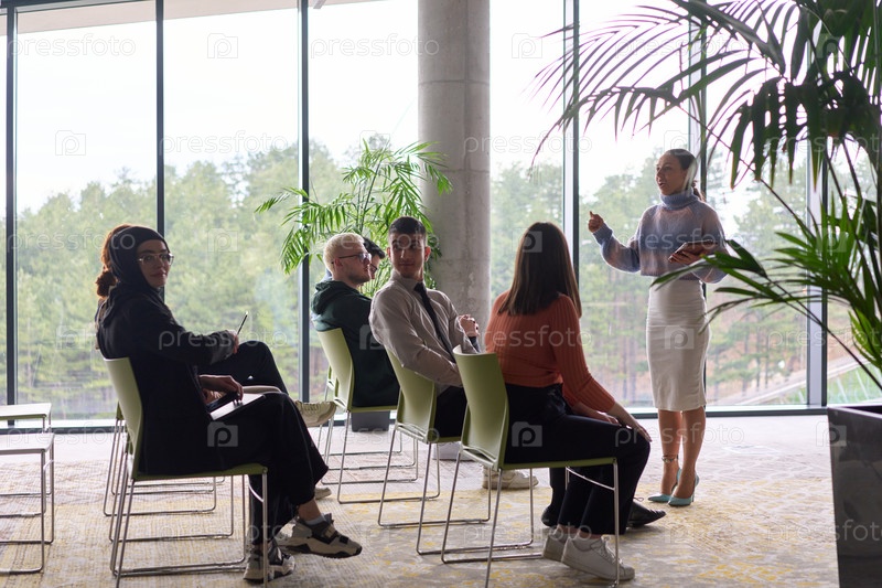 Бизнес-леди-лидер проводит встречу с коллегами, обсуждая проблемы бизнеса, маркетинговые стратегии и новые планы роста и успеха