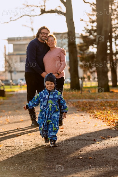 Радостный маленький мальчик в зимнем пальто и шапке играет в парке, окруженный любовью и теплом своих улыбающихся родителей