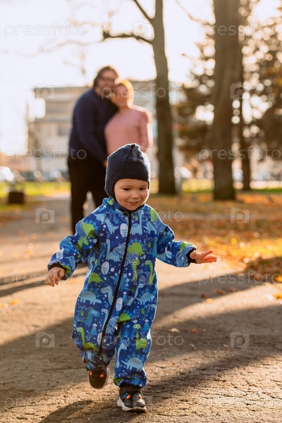 Радостный маленький мальчик в зимнем пальто и шапке играет в парке, окруженный любовью и теплом своих улыбающихся родителей
