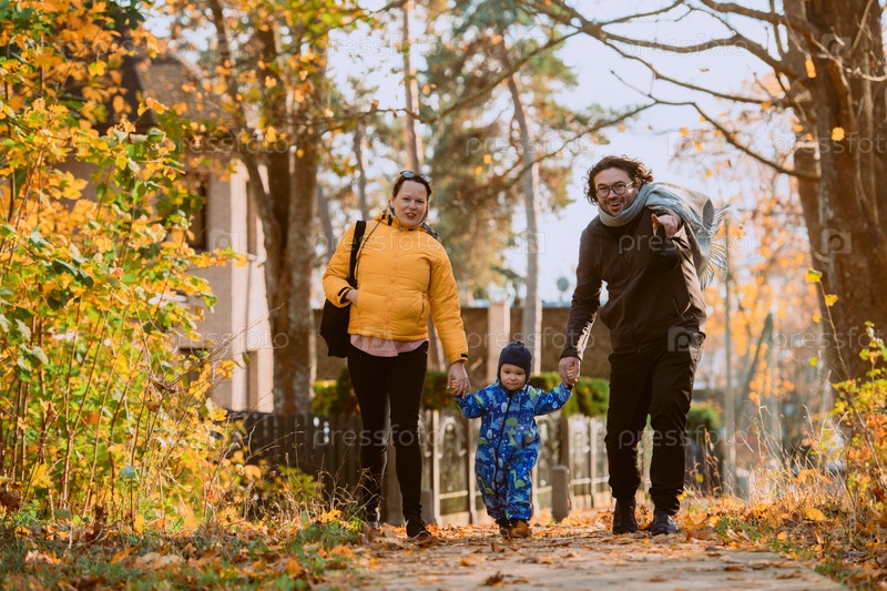 Влюбленная пара прогуливается по залитому солнцем парку со своим маленьким сыном, окруженная яркими красками осени, наслаждаясь радостными и мирными моментами совместного семейного общения
