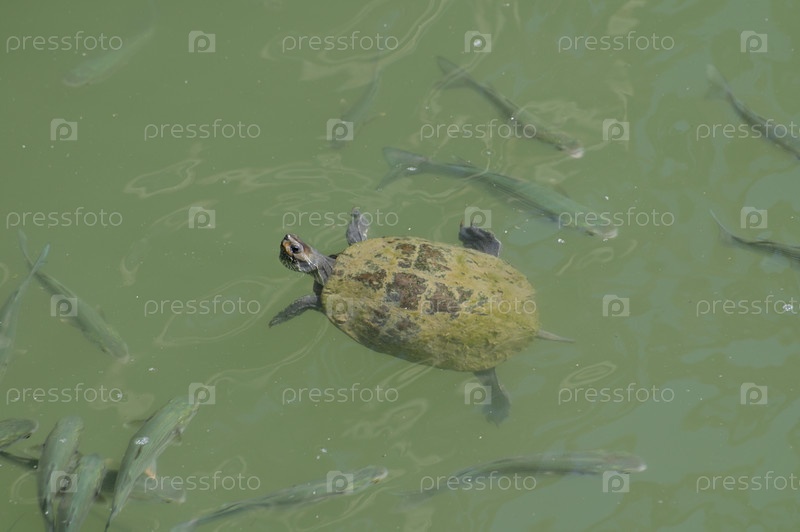Маленькая черепаха в мутной речной воде. Рыбы плавают вокруг