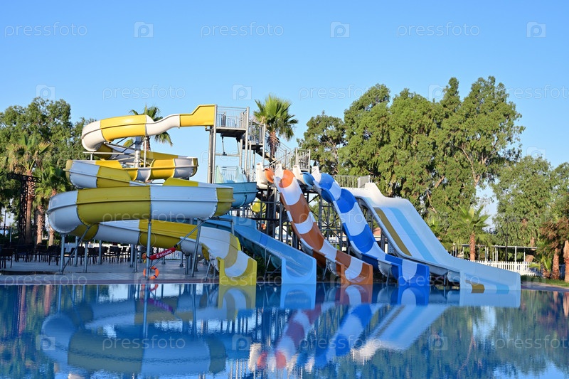 Детские водные горки рядом с бассейном. Раннее утро, людей нет