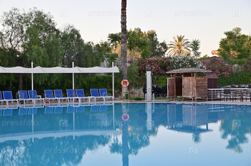 Бассейн в прибрежном отеле. Раздевалки, шезлонги и навесы от солнца. Спасательный круг на дереве