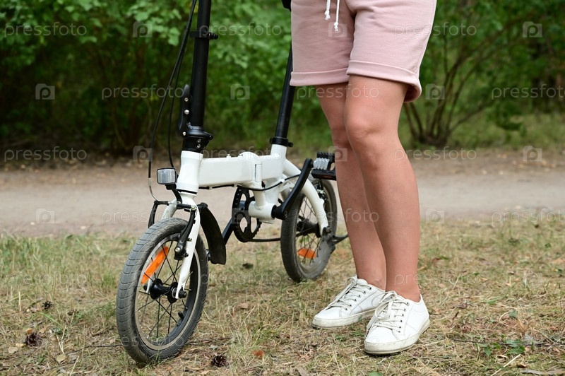 Компактный складной велосипед рядом с ногами взрослой женщины. Женщина стоит в бежевых шортах и белых кроссовках
