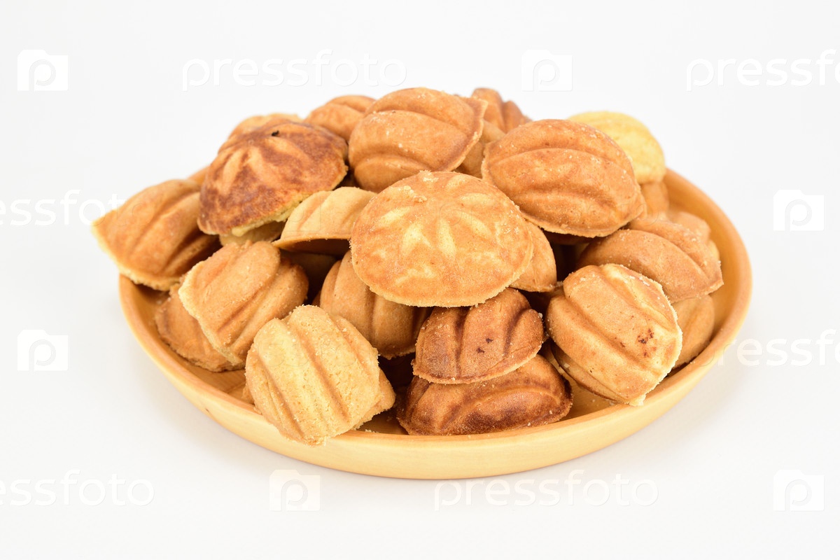 Печенье из скорлупы грецких орехов, выложенное горкой на деревянной тарелке