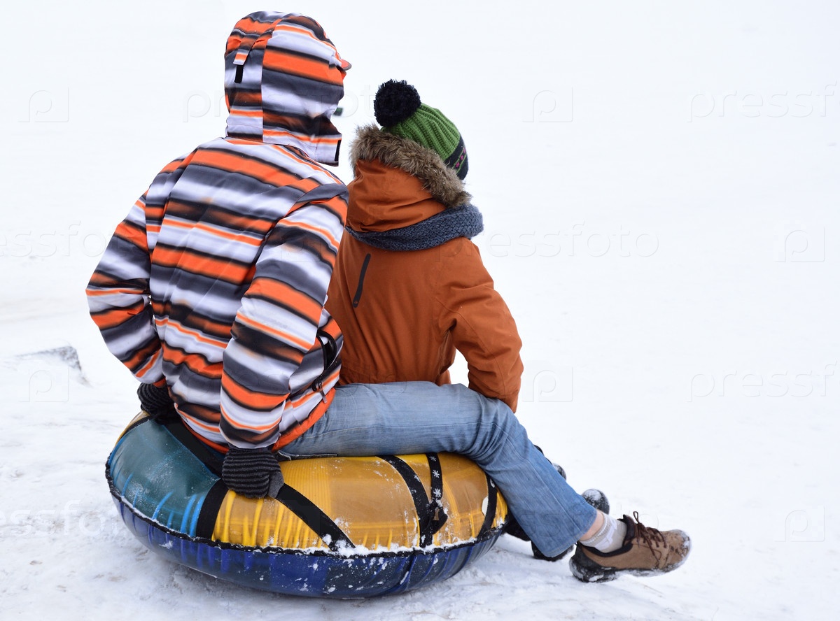 Мужчина и мальчик катаются с горы на надувном снежном тюбе