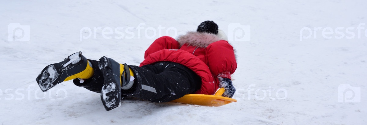 Девочка катается на пластиковых санках, лежа на животе