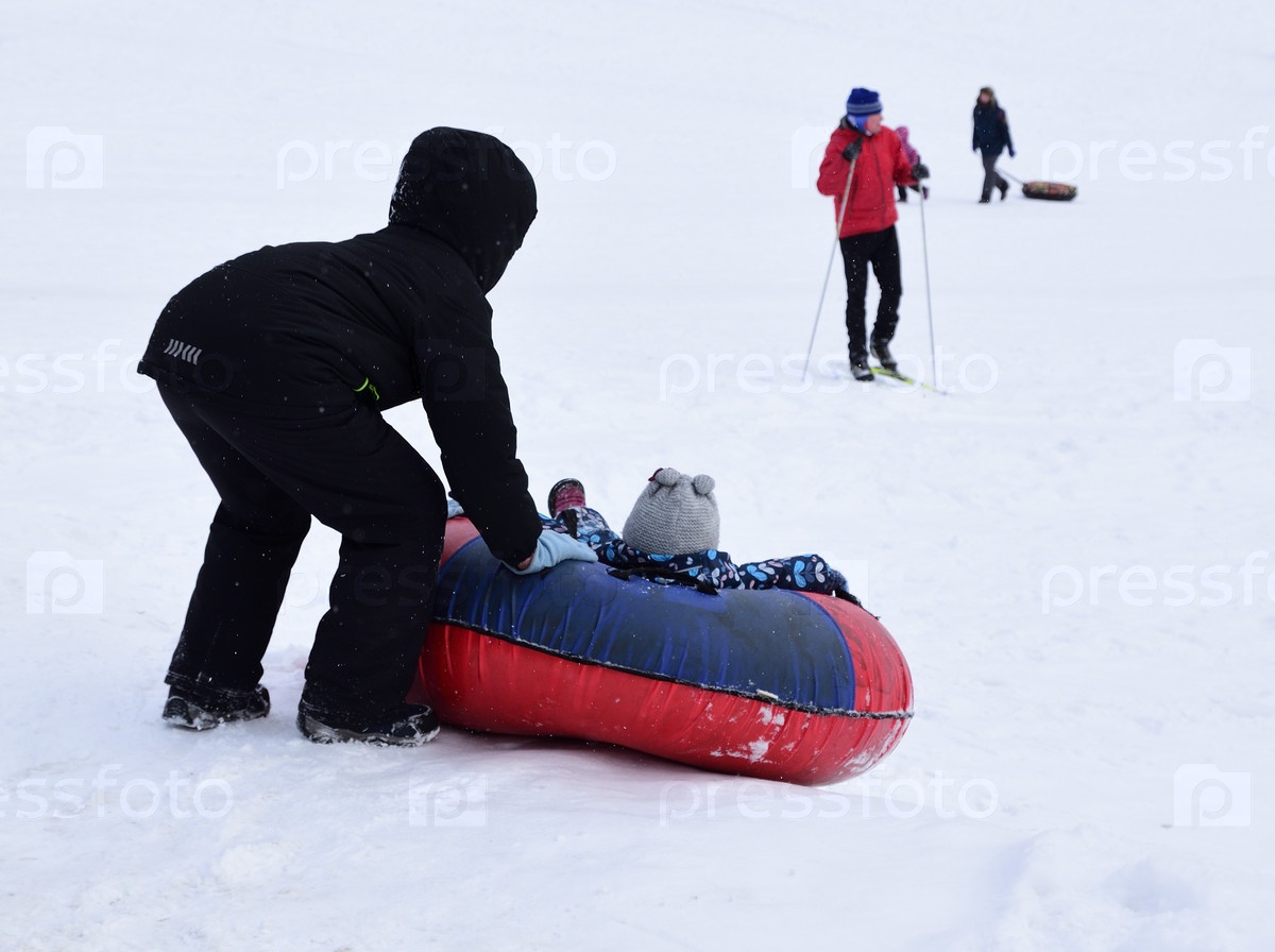 Старший брат катает младшего с горки на надувной ватрушке