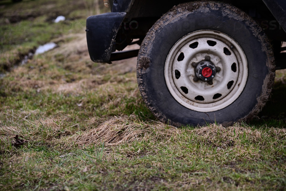 Колесо внедорожника испачкано грязью. На заднем плане дорога, размытая дождями