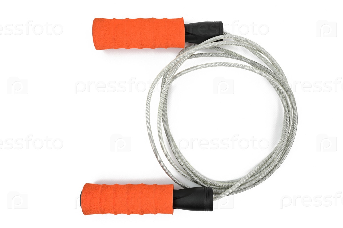 Скакалка для художественной атлетики из металлического каната в прозрачной оболочке. Оранжевые ручки из жесткого пенопласта