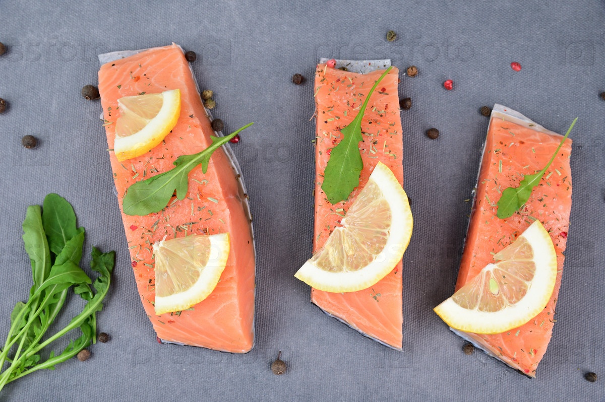 Кусочки филе лосося, посыпанные приправами и солью, с дольками лимона и зелеными листьями