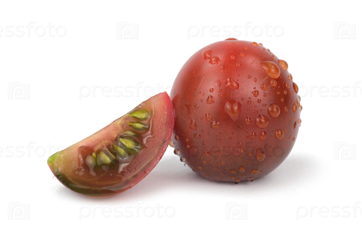 Черный помидор с капельками воды. Рядом лежит ломтик другого помидора