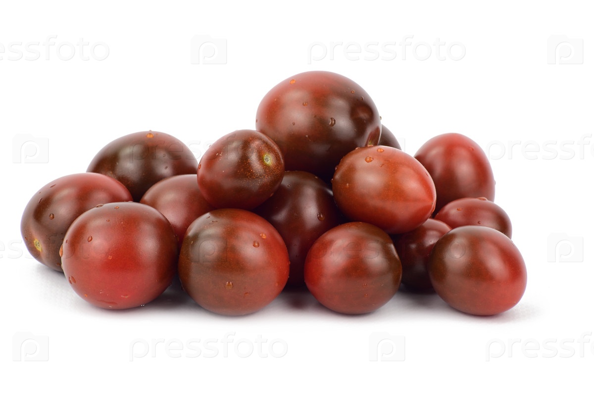 Черные помидоры выложены небольшой горкой. Капельки воды блестят на кожуре