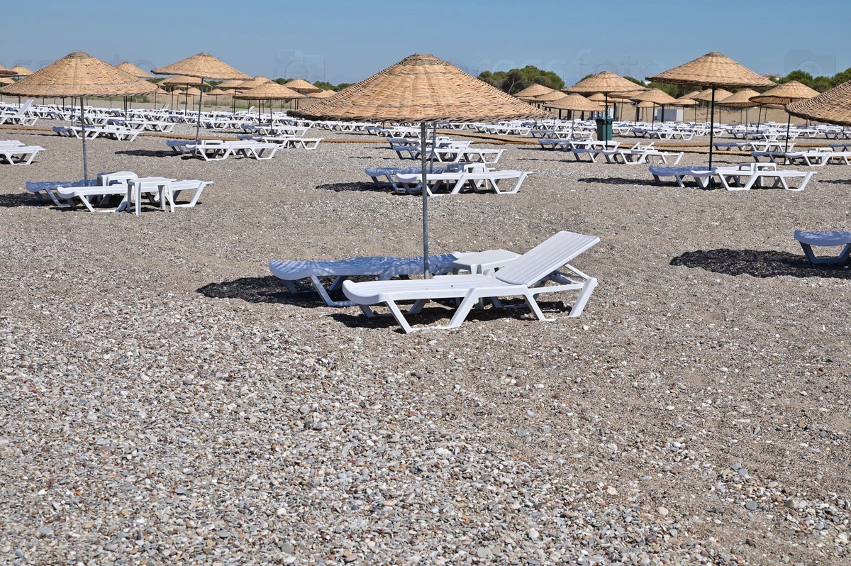 Шезлонги и зонтики на необитаемом пляже, заброшенном из-за инфекции COVID-19