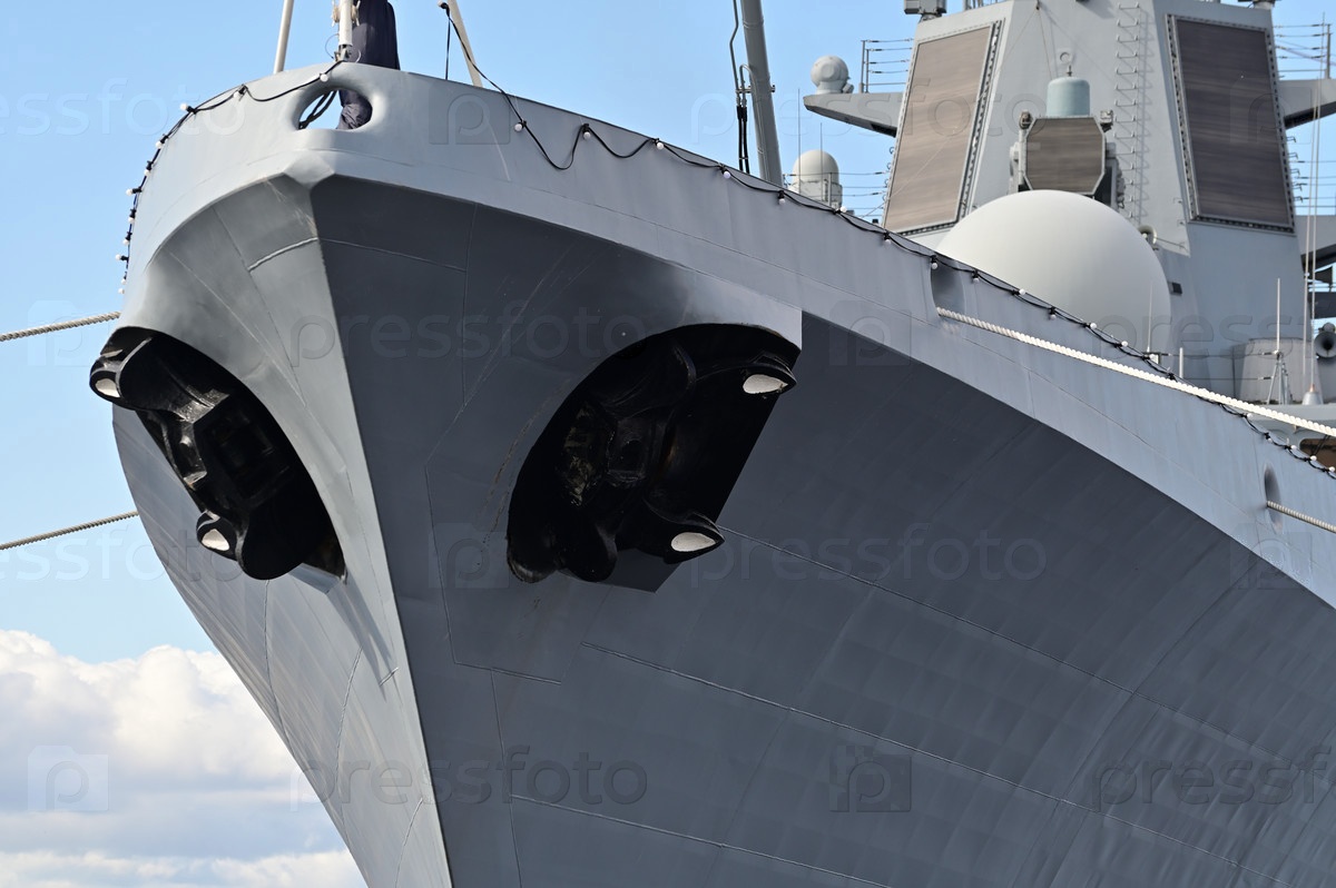 Нос военного корабля. Черные якоря торчат с обеих сторон
