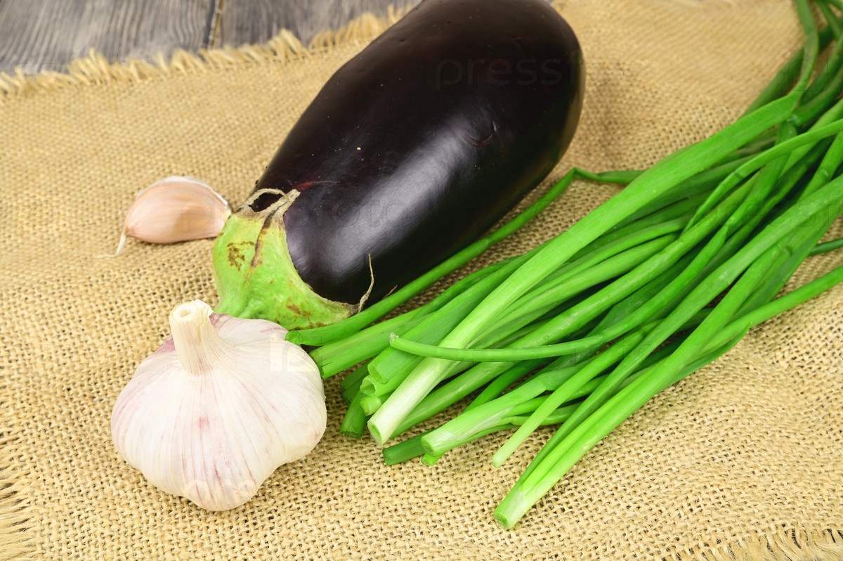 Спелые баклажаны, головка чеснока и зеленый лук на грубой льняной салфетке