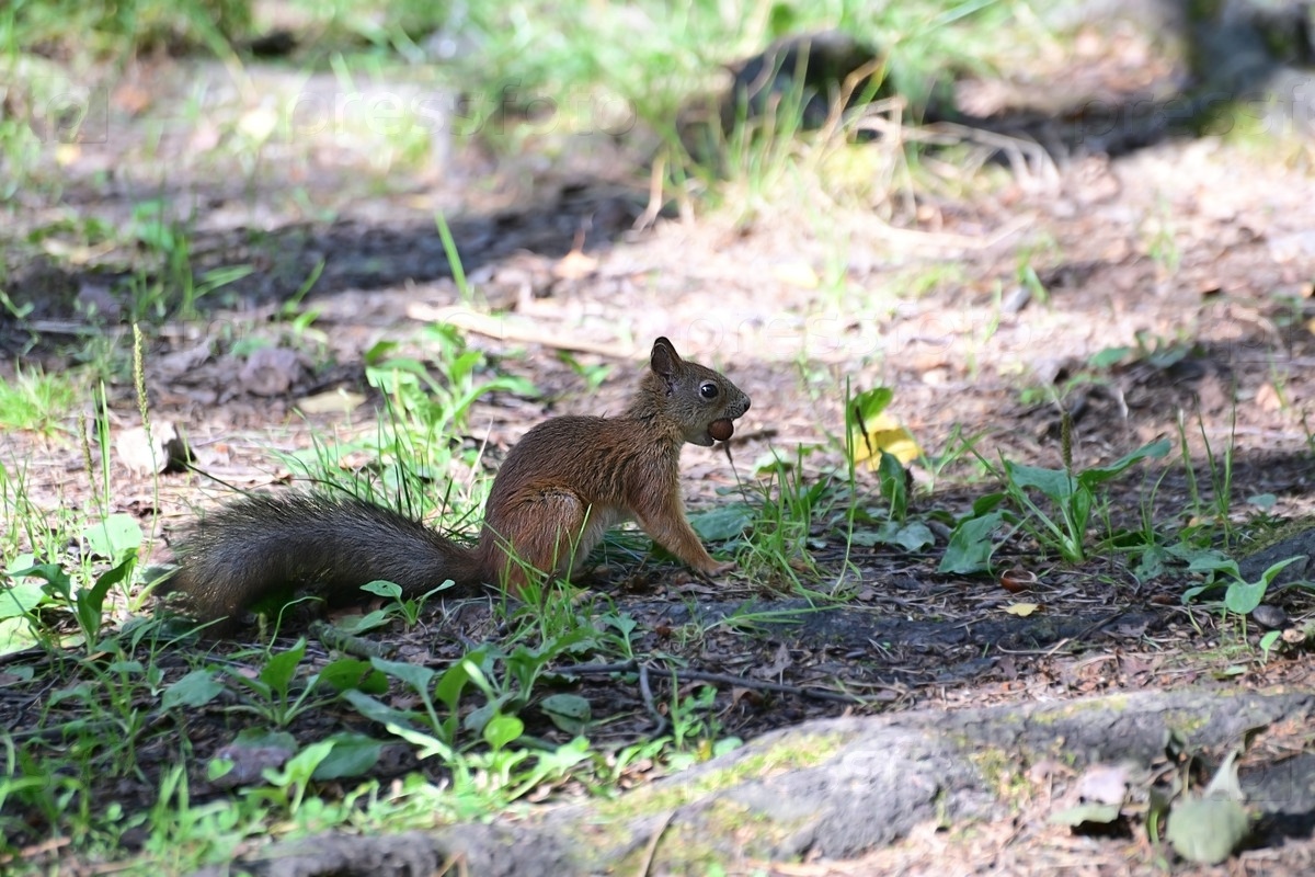 Белка с длинным пушистым хвостом сидит на земле и держит в зубах орех. Она сидит в тени дерева