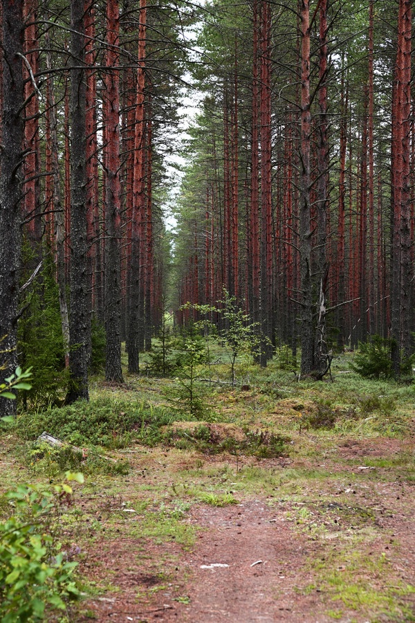 Поляна в сосновом лесу. Красноватые стволы сосен