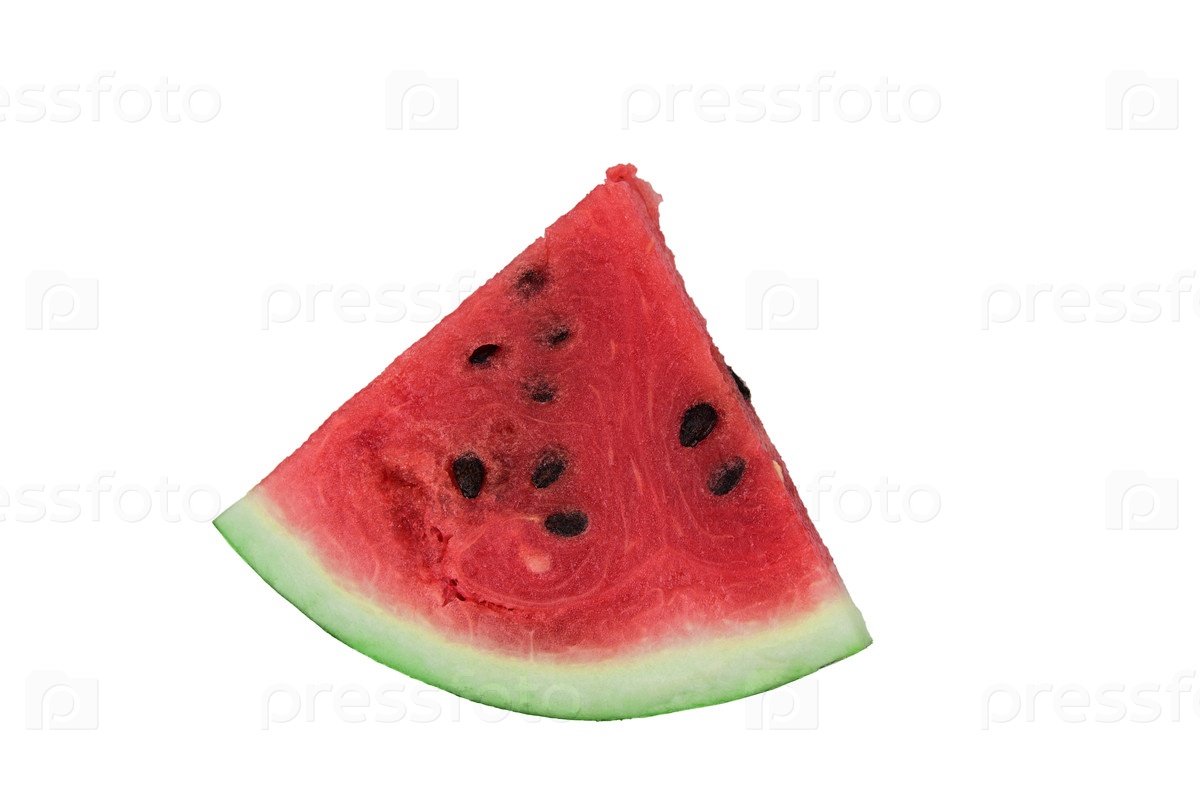 Кусочек спелого красного арбуза в форме треугольника с черными семенами. Изолирован на белом фоне