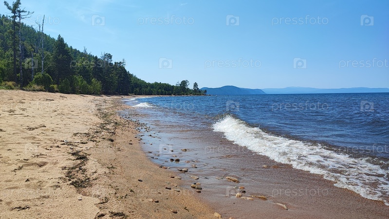 Песчаный пляж на озере Байкал недалеко от деревни Гремячинск, Бурятия, Россия