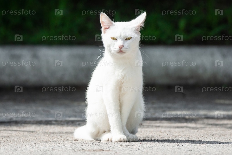 Белый кот на асфальте