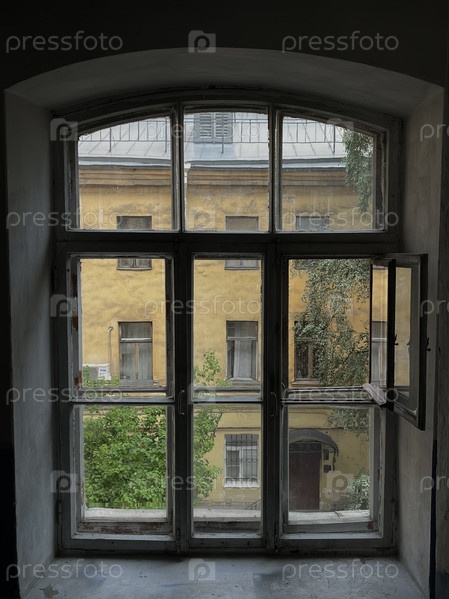 Вид из исторического окна, на котором видно желтое здание и зелень во дворе в дневное время