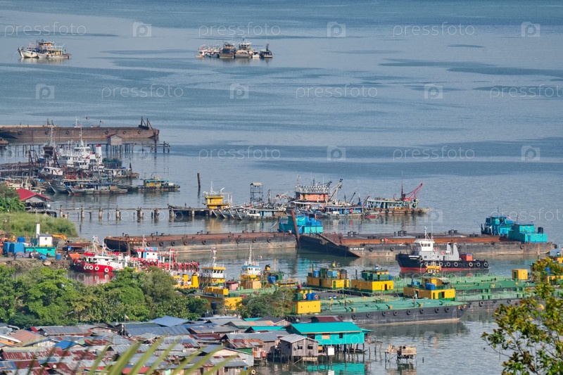 Сандакан. Малайзия. 27 ноября 2018 г. Вид на побережье Тихого океана в городе, которое перемежается пристанями для яхт, кораблями и хижинами цыган-рыбаков на сваях