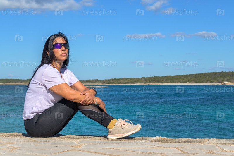 Женщина сидит на берегу океана, глядя вдаль, красивая латиноамериканка у моря в Колония-Сан-Жорди, Балеарские острова, Майорка, Испания