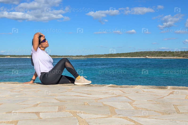 Латиноамериканка, 48 лет, сидит на пирсе в Колония-де-Сан-Жорди, Майорка, Испания. Солнечный день ранней весны у бирюзового моря, наслаждаясь мирным прибрежным видом