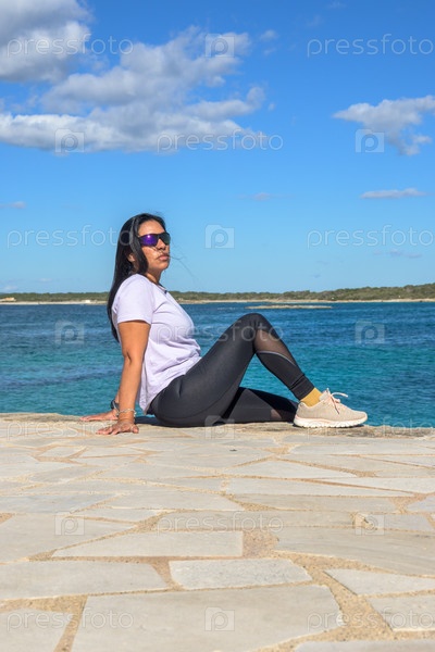 Латиноамериканка, 48 лет, сидит на пирсе в Колония-де-Сан-Жорди, Майорка, Испания. Солнечный день ранней весны у бирюзового моря, наслаждаясь мирным прибрежным видом
