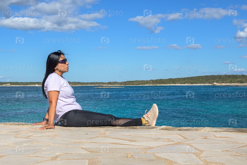 Женщина сидит на берегу океана, в солнцезащитных очках, красивая латиноамериканка у моря в Колония Сан Жорди, Балеарские острова, Майорка, Испания,