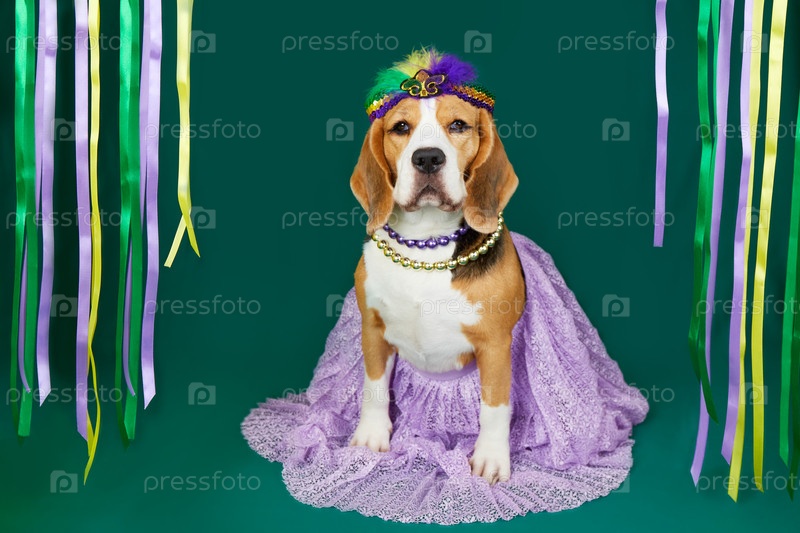 Собака породы бигль в костюме для фестиваля Марди Гра