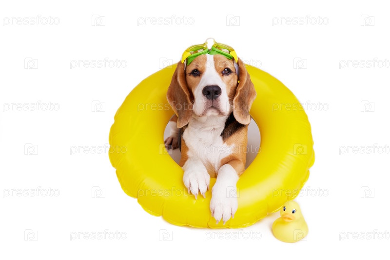 Собака породы бигль в надувном плавающем круге на белом изолированном фоне