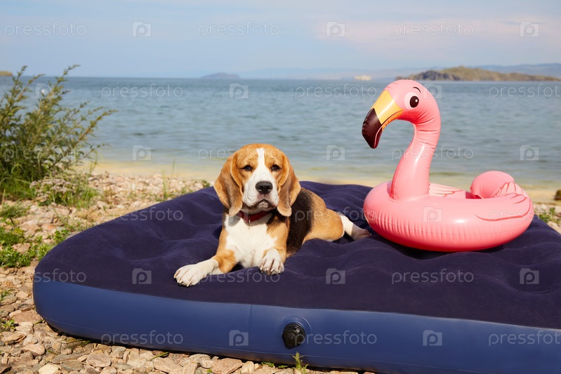 Собака породы бигль лежит на надувном матрасе на пляже у моря