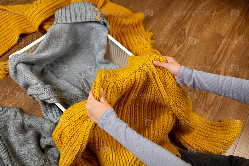 Молодая женщина аккуратно складывает стопки одежды в металлическую корзину для белья